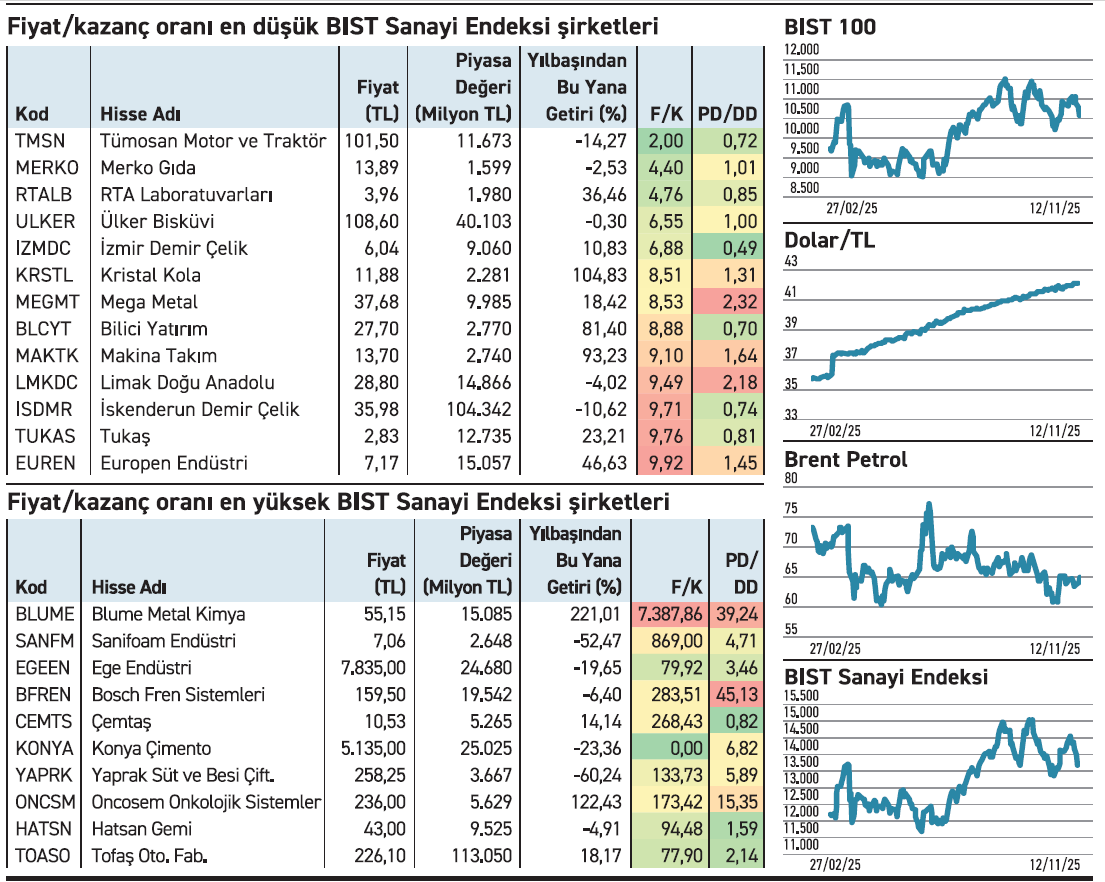 Ekonominin üretim ve ihracat kapasitesini yansıtan en geniş endekslerden biri olan BIST Sanayi Endeksi; enerji, kimya, metal ve makine gibi farklı firmaları kapsıyor. Bu endekse dahil 238 şirket bulunurken bunlardan F/K oranı hesaplananların sayısı 104 seviyesinde. 13 şirketin oranı 10’un altında oluşurken biri 2 ile en düşük düzeyde. En yüksek oran ise 7.388 ile öne çıkıyor. BIST Sanayi Endeksi’nde yer alan Tümosan, 2 ile F/K oranı en düşük şirket konumunda. Altı aylık faaliyet döneminde gelirini %54 geriletti ve esas faaliyetlerinden ötürü zarar yazdı. Sahip olduğu taşınmazlardan gelen 9,1 milyar TL değer artışıyla dönem sonu 6,6 milyar TL kâr açıkladı. Firmanın esas faaliyetlerinden kâra kavuşamaması yatırımcının temkinli kalmasında belirleyici faktör. Listede ikinci sırada yer alan Merko Gıda’nın F/K oranı 4,40 seviyesinde. Bilanço dönemi 1 Temmuz 30 Haziran arası olan şirket, son açıkladığı üç aylık tablolarında zararda. Zayıf ticari performansa sahip olması ilgiyi sınırlandırırken oranın da düşük seviyede kalmasına yol açıyor. Eski ünvanıyla Metemtur yeni ünvanıyla Blume Metal, 7.388 ile oldukça yüksek F/K oranına sahip. Firmanın faaliyet alanı değişikliği, birleşmeler, devralmalar, Bulgaristan’da şirket kurulması gibi açıklamalarıyla belirgin bir hareketlilik söz konusu. Gelen açıklamalar ilgiyi destekliyor. Haziranda 20,02 TL seviyelerinden ağustosta 74,40 TL’ye kadar çıktı. Ardından yataya döndü. Bu hareketliliğin bilançoya da yansıması gerekiyor.