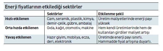 Bu soruya cevap ararken, en az üç faktörü dikkate almamız gerekiyor: Sektörlerin üretimde enerji yoğunluğu, sektörlerin enerjiye dayalı girdi yoğunluğu, sektörlerin maliyet artışlarını tüketiciye yansıtma kapasiteleri. Her sektör aynı oranda enerji kullanmadığı, petrol ve türevlerini girdi olarak kullanmadığı için fiyat artışlarından aynı oranda ve aynı hızda etkilenmez.