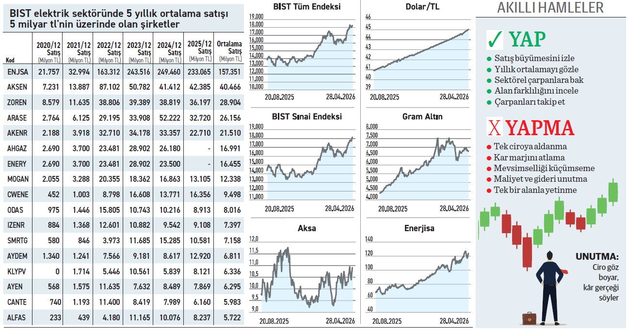 Geçmiş yılların fiyat şokuyla gelen ciro artışlarına bakıp rehavete kapılmak yatırımcı için en büyük tuzaktır. Asıl maharet, ekonomi daraldığında da o ciro ve kârı büyütebilmektir. Yüksek enflasyonun sakinleştiği ve sanayide çarkların yavaşlayarak döndüğü 2025’te, cirolar da duruldu. Öyle ki, sektörün 157,4 milyar TL ile hacim lideri Enerjisa makroekonomik soğumadan nasibini alarak vites küçültmek zorunda kaldı. Genel zayıflama sürecinde sektördeki 4 firma satışını artırarak diğerlerinden ayrıştı. Bunlardan CW Enerji ve Aksa Enerji kârlı yapıyı korurken, gelirini en hızlı artıran Aydem Enerji ve Kalyon Güneş bu performansı zarar pahasına gerçekleştirdi.