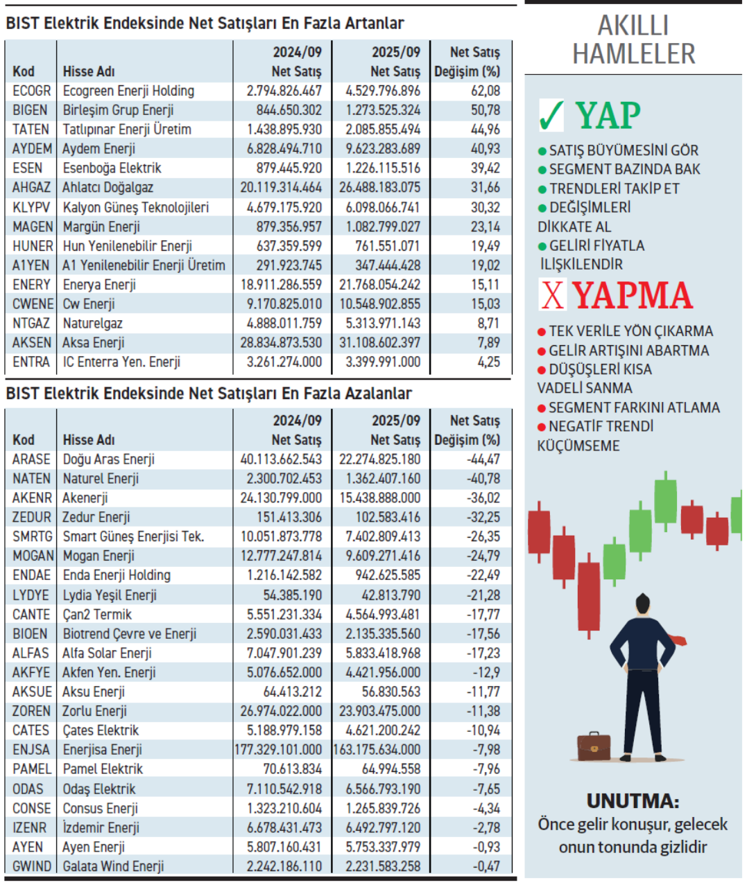 Ecogreen Enerji Holding, dokuz aylık dönemde net satışlarını %62 artırırken dönem sonu kârını %84 düşürdü. Kârın azalmasında artan finansal giderlerin etkisi gözleniyor. Geçtiğimiz kasım ayının ilk haftası borsaya gelen hisse, iki hafta tavan serisinin arından 18 Kasım günü en yüksek 31,98 TL’yi test etti. Buradan gelen kâr satışlarının ardından geriledi. Birleşim Grup Enerji, %51 ile net satışını en fazla büyüten sektörün ikinci şirketi. Artan net satışlara rağmen firma dönem sonunda zarar yazdı. Geçtiğimiz şubat ayında borsada işlem görmeye bağlayan hisse, geçen sürede dalgalı bir seyirle aşağı kaydı. Satış baskısı devam eden hissenin fiyatı, ilk açılışı olan 13 TL’nin gerisinde duruyor. Enerji sektöründe dokuz aylık dönemde net satını en fazla düşüren Doğu Aras Enerji oldu. Yüzde 44,47’lik daralmayla net satışları 22,3 milyar TL’ye geriledi. Buna karsın dönem sonu kârı, azalan finansal giderlerle birlikte %383 büyüyerek 1,6 milyar TL’ye çıktı.