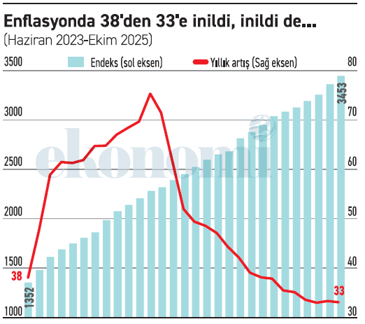 Küsuratları dikkate almıyorum; iki buçuk yıla yaklaşan Haziran 2023-Ekim 2025 döneminde yıllık enflasyon yüzde 38’den yüzde 33’e inmiş.