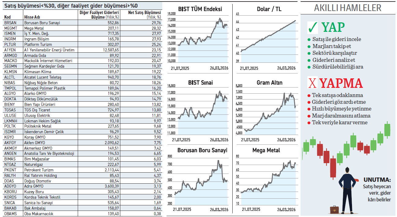 Borsadaki 36 şirketin gelir tablosunun üst sırasında duran satış rakamının gerisinde, kârlılığı kemiren faaliyet dışı giderler duruyor. Listeye giren A1 Yenilenebilir Enerji’nin gelir artışı sınırlı kalırken, esas faaliyet dışı giderindeki artış 13 kat yükseldi. Güçlü yapılara sahip İş Yatırım ve Borusan Boru için aynı oranda olmasa da yine artan bir faaliyet dışı gider söz konusu. Veriler, listeye giren kimi firmalar açısından operasyonel verimliliğin baskı altına olduğunu söylüyor. Faaliyet dışı gider artışının satış hızını geçtiği ortamda, kâr marjları ister istemez daralır.