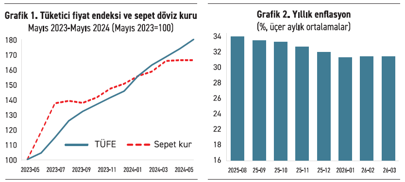 Politika faizinin uzunca bir süre enflasyonun çok altında kalmasına izin verilmesi, beklenen sonucu hemen gösterdi: Döviz kuru sıçradı. Türkiye’de döviz kuru artışı enflasyonu yükselten ana unsur. O dönemde enflasyondaki yükselişin tek nedeni değil elbette ama açık ara en önemli nedeni kurun sıçraması. İlk grafikte Mayıs 2023 ile Mayıs 2024 döneminde yarısı Euro yarısı da dolardan oluşan döviz sepetinin değeri ile tüketici fiyat endeksinin seyri gösteriliyor (her ikisinin başlangıç değerleri, ‘okumayı’ kolaylaştırmak için 100 olarak alındı).