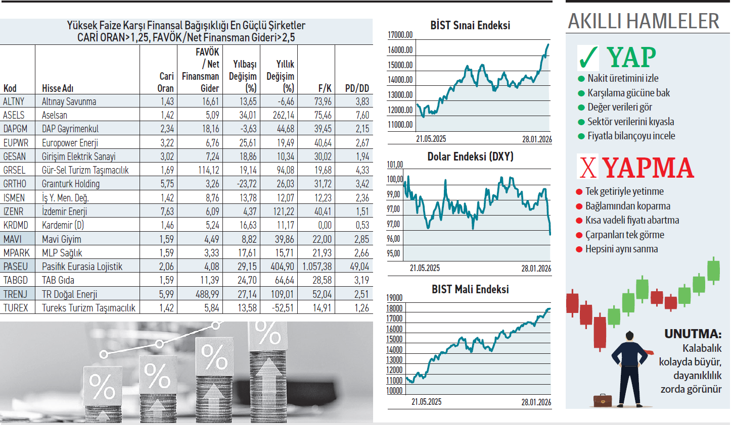 Firmaları zor duruma düşüren kârsızlıktan ziyade nakit yetmezliğidir. Yüksek faiz ortamında nakit kraldır, kuralı işler. Faizlerin bilançoları kemirdiği bir dönemde, cari oranı zirvede olanlar ya da finansman giderini çok rahat karşılama gücüne sahip şirketler, kriz anında sakinlerdir. Yatırımcılar da sıkıntılı dönemlerde makyajlı kârlar yerine firmaların borç ödeme kapasitesine bakar. Kısa vadeli yükümlülüklerini sorunsuz yönetme kabiliyetine sahip şirketler, olası fırtınalarda yara almadan çıkabilecek en güçlü adaylardır.