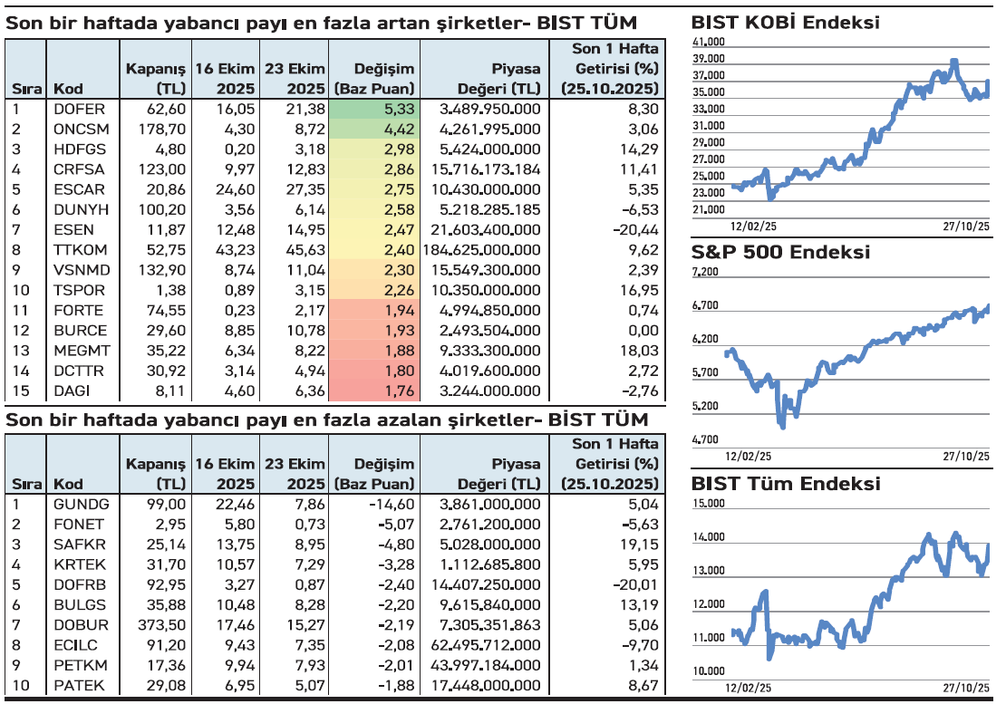 16–23 Ekim haftasında yabancı yatırımcılar 15 hissede paylarını 1,76 puan ve üzeri artırdı; 10 hissede ise 1,88 puan ve üzeri düşüş yaşandı. Payın en fazla azaldığı hissede gerileme 15 puana yaklaşırken fiyat yükselişini korudu.