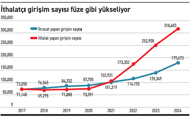 2024’te makasın oransal olarak biraz kapanmasına bakarak ithalatçı girişim sayısının azaldığını da düşünmeyelim. Çünkü durum tam tersine. 2024 yılında ihracatçı girişim sayısı 40 bin 324 adet artarken ithalatçı girişim sayısındaki artış 65 bin 695 ile ihracatçı sayısındaki artışın 1.5 katından fazla oldu.