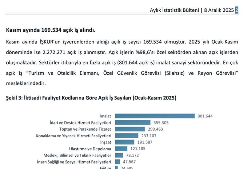 Ocak-Kasım dönemindeki açık iş 2.272.271 ya, bunun tam 801.644’ü imalat sanayinde. Neredeyse bir milyon açık işten söz ediliyor, hem de yalnızca imalat sanayinde!