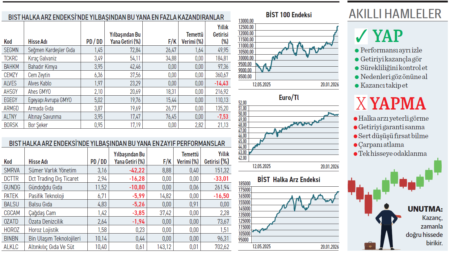 Halka Arz Endeksi yılbaşından bu yana %11,11 ile güçlü bir çıkış sergilemiş görünse de BIST 100 Endeksi’nin %13,20’lik yükselişinin gerisinde kaldı. Bu durum yatırımcıların borsanın yeni şirketleri yerine bilindik sınanmış firmalara yönelmeyi tercih ettiğini söylüyor. Halka Arz Endeksi’nde ise hisseler ciddi bir hareketlilik yaşıyor. Seğmen Kardeşler Gıda ve Kıraç Galvaniz’in fiyatı üç haftada %50’nün üzerine çıkarken, Sümer Varlık Yönetim %42 ile en fazla düşenler arasında yer aldı.