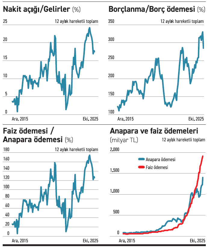 Bunun başlıca iki nedeni var: Birincisi gelir-gider dengesinin bozukluğunun devam ediyor olması. İkincisi ise nakit dengesi üzerindeki olumsuz etkisi son dönemde iyice artan fahiş faiz ödemeleri. Ekim ayı itibarıyla 12 aylık toplam faiz dışı gider miktarındaki artış yüzde 37 ile TÜİK’in enflasyon oranlarına yakın bir düzeyde. Ama faiz ödemeleri yüzde 76 ile bunun iki katından daha hızlı bir artış kaydetmiş.