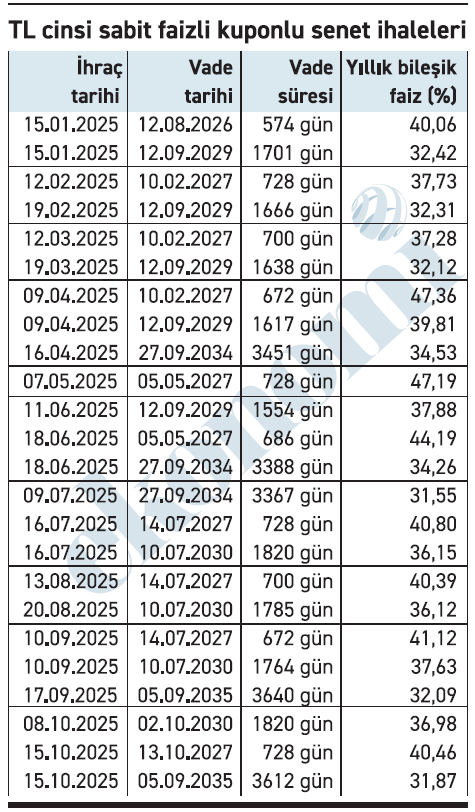 Vadesi Ekim 2027’de dolacak iki yıl vadeli ihalede yıllık bileşik faiz yüzde 40,46.