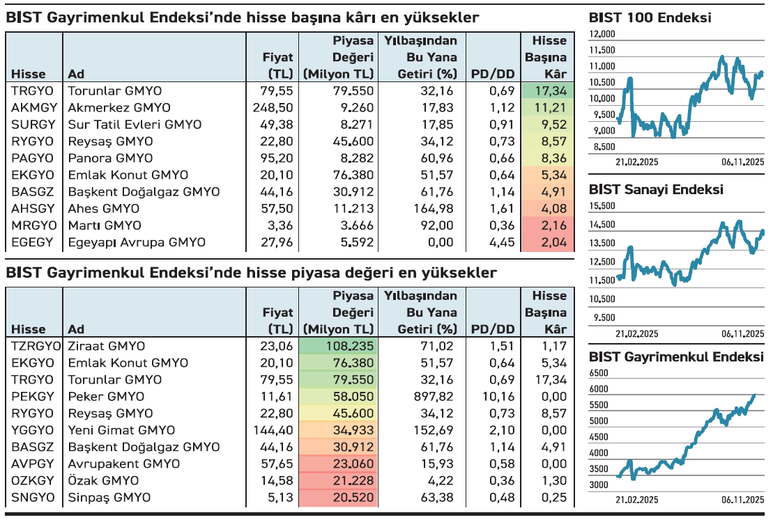 Bir şirketin elde ettiği net kârın hisse sayısına bölünmesiyle hisse başına kâr elde edilir. Her bir pay için ne kadar kazanç yarattığını bilmek hisse tercihinde önemli bir referanstır. BIST GMYO kapsamındaki şirketlerden hisse başına kârı 2 TL’nin üzerinde olan 10 firma bulunuyor. Bunlardan birinin tutarı 17 TL’nin üzerine çıktı. Yılbaşından bu yana %897 ile en yüksek çıkışı gerçekleştirenin kârı ise yok. Hisse başına kârı olmayan Peker GMYO, özellikle temmuzdan bu yana abartı bir yükseliş sergilerken yılbaşından bu yana %897 yükseldi. Firmanın büyük ortağı farklı zamanlardaki satışlarla payını %31,26 olan %6,30’a düşürdü. Fiyat temelli beklenti alımları motive ediyor. Ancak F/K ve PD/DD oranları aşırı yüksekliğe işaret ediyor.