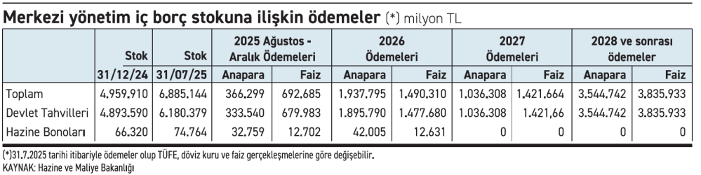 “İç borçlanma durumunu yansıtan tabloda ise 2025 Temmuz ayı itibarıyla 2 trilyon 332,0 milyar TL tahvil ve 113,9 milyar TL tutarında bono ihracına karşılık, 2025 Temmuz ayı itibarıyla 415,3 milyar TL tahvil anapara ödemesi ve 105,5 milyar TL bono anapara ödemesi olmak üzere toplam 520,7 milyar TL anapara ödemesi yapıldığı görülmektedir. Aynı tarih itibarıyla faiz ödemeleri ise toplam 985,6 milyar TL olarak gerçekleşirken yapılan net borçlanma 1 trilyon 925,2 milyar TL olmuştur.”