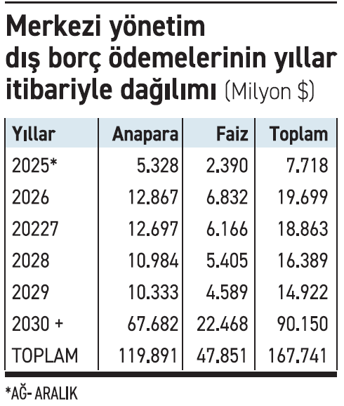 Dış borçta ana para ve faiz ödemeleri toplamı 167,7 milyar $