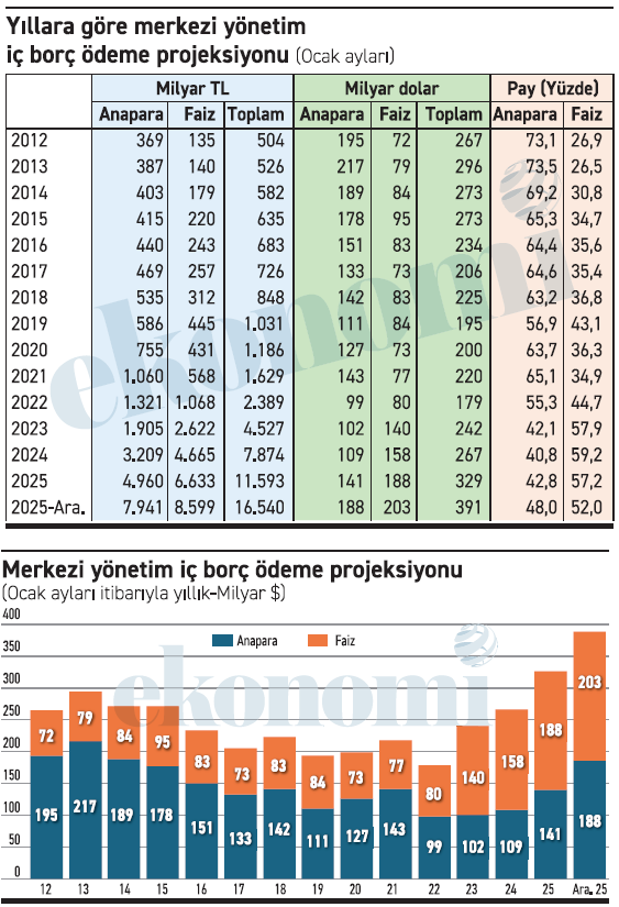 2012’de iç borç yükünün yaklaşık dörtte üçü anapara, dörtte biri faizken, son durumda anaparanın payı yüzde 48, faizin payı yüzde 52 düzeyinde. Bu geçiş de zaten ödemede anapara-faiz değişiminin tipik bir göstergesi.
