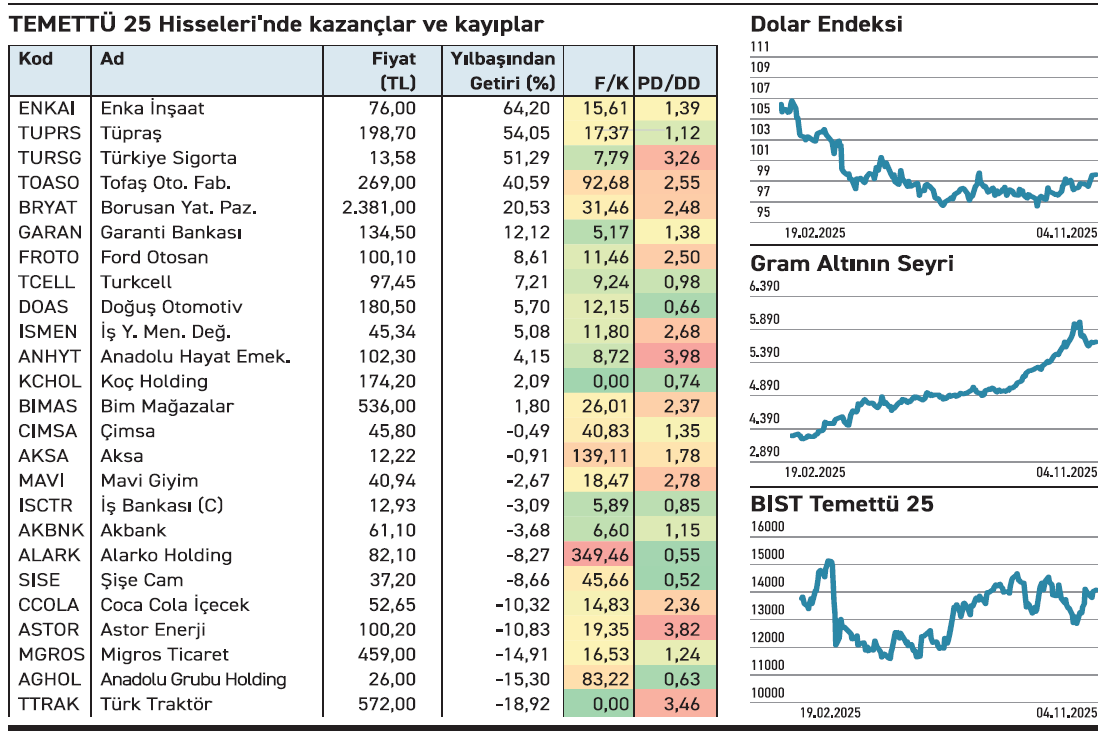 BIST Temettü 25 Endeksi’nde yılbaşından bu yana en yüksek artışı %64,20 ile Enka İnşaat gerçekleştirdi. Hisse uzun vadede istikrarlı yükselişiyle dikkat çekiyor. Arada kâr satışları gelse de yükselen trendini koruyor. Zaman zaman ortak alımları da gözlenirken, gelir ve kârdaki büyümesini sürdürüyor. Aldığı yeni işler yıllık gelirinin %128’ini aştı. En fazla yükselen diğer bir hisse %54,05 ile Tüpraş. Hissede özellikle mayıstan bu yana yaşanan ivme dikkat çekiyor. Açıkladığı dokuz aylık bilançosunda gelirini %25 esas faaliyet kârını %19 düşürse de dönem sonu net kârını %21 büyüttü. Şirket Net Rafineri Marjı beklentisini varil bazında 6-6,5 dolara çıkardı. Daha önceki beklentisi 5-6 dolar idi. Yüksek getirisi ile dikkat çeken bir diğer hisse ise Türkiye Sigorta. Yılbaşından bu yana %51,29 yükseldi. Açıkladığı dokuz aylık bilançosunda kârını yüzde 48,79 artırdı. BIST Temettü 25 hisselerinde yılbaşından bu yana en fazla geride kalan %18,92 ile Türk Traktör oldu. Şirket dokuz aylıkta satışlarını %41, dönem sonu kârını %87 düşürdü. Yapı Kredi’nin YAS fonu, Tüpraş’taki kârını realize ederken fiyatı geride kalan Türk Traktör’deki payını artırdı.