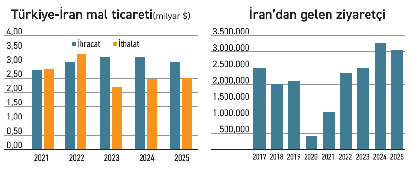 2025 yılında İran'dan Türkiye'ye gelen ziyaretçi sayısı 3 milyondu. Bu, yabancı ziyaretçilerin yaklaşık %6’sı anlamına geliyor. Ülkemize gelen İranlıların yaklaşık üçte biri sınır kapılarından kara taşıtlarıyla giriş yaparken, büyük kısmı havayolunu kullanıyor. Gerek kara gerek hava yolu ile gelenlerin yine önemli bir bölümü, iş amacıyla geliyor ve kısa süre sonra ülkelerine dönüyorlar. Bu nedenle, turizm gelirlerimizin de yüzde 6’lık kısmı İranlılardan geliyor diyemeyiz. Yine de kara sınırlarımızın olduğu illerdeki ticari aktivitenin önemli bir kısmını İran’lı ziyaretçiler oluşturuyor.