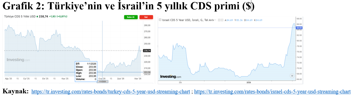 ABD-İsrail güçlerinin İran’a saldırdığı 28 Şubat 20262 tarihinden bu yana Türkiye’nin riskleri daha da arttı. 1.1.2026 tarihinde 204’e kadar inen ülke (5 yıllık CDS) risk primi, 5.3.2026’da 239’a kadar yükseldi. Yani % 17 arttı. Savaştaki İsrail’in risk primi ise 5.3.2026’da 85 olarak gerçekleşti. Bu değer yılbaşından bu yana %25’lik artış anlamına geliyor. İlginç değil mi? Savaşan İsrail, ama Türkiye’nin değerli yalnızlığının risk primi olarak faturası İsrail’in neredeyse 3 katı. Risk primindeki artışta ise İsrail bizden sadece üç beş adım önde.