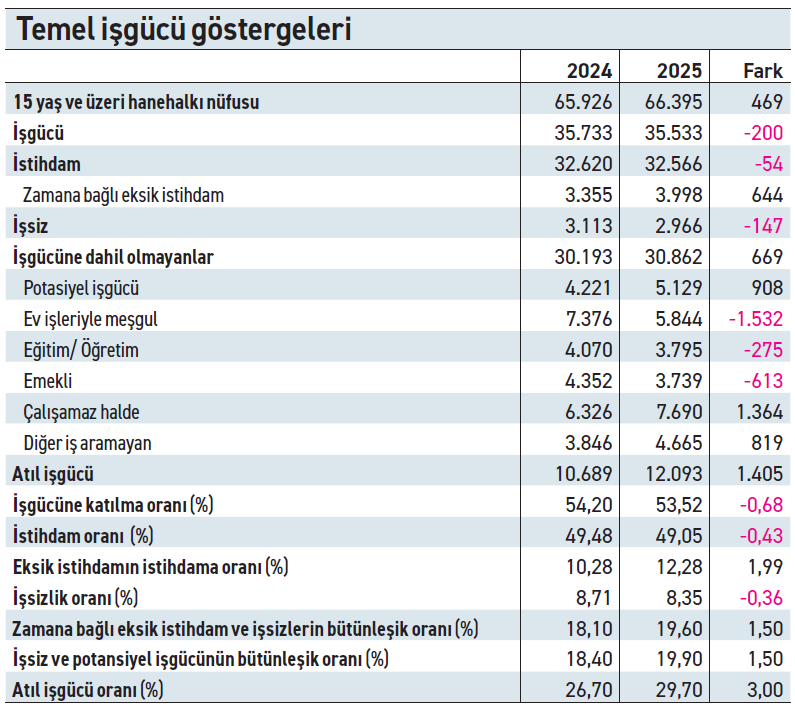 - TÜİK verilerine göre göre bu garip durumun kaynağı, çalışmadığı halde çeşitli nedenlerle iş aramaktan vazgeçenlerin sayısının ciddi ölçüde artmış olması. İşgücü dışında sayılan grubun nüfusunda 669 bin kişilik artış var. İşgücü dışına çıkanların sayısı nüfustan fazla artınca işgücü içinde sayılanların miktarı da düşmüş oluyor.