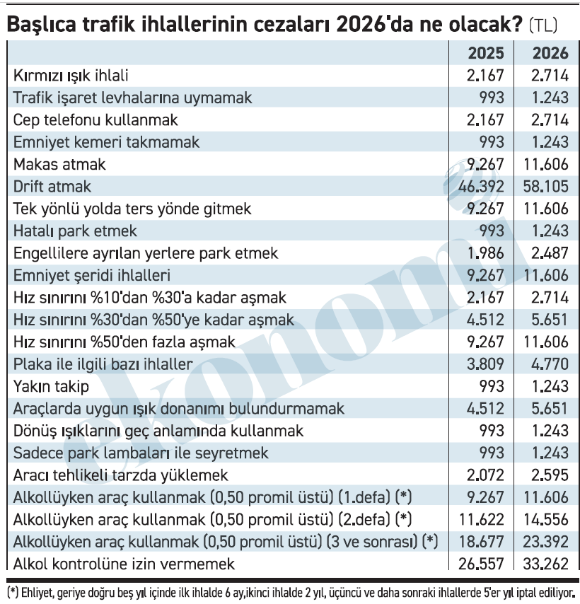 Trafik cezaları 2026 yılında bu yıla göre yaklaşık yüzde 25,25 oranında artırılacak.