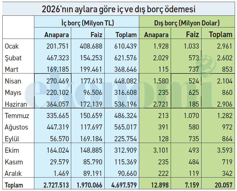 Bu tutarın 4,7 trilyonu iç borç anapara ve faizi, yaklaşık 1 trilyonu da dış borç anapara ve faizi. Dış borç 20,1 milyar dolar. Dış borca ilişkin tutarın merkezi yönetimin yapacağı ödeme olduğunu özellikle belirtmek gerekiyor. Bu tutara tabii ki özel sektörün ve bankaların yapacakları ödemeler dahil değil.