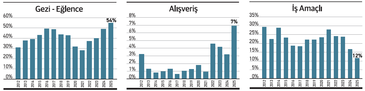 Son derece dikkat çekici bir başka detay ise, Türklerin alışveriş amaçlı yurtdışı ziyaretlerindeki artış. Önceki yıllarda 100 bin civarında seyreden bu veri son birkaç yılda 300-400 bine yükseldikten sonra 2025’te 800 binin üzerine sıçradı ve toplam yurtdışı ziyaretlerdeki payı yüzde 7 oldu.