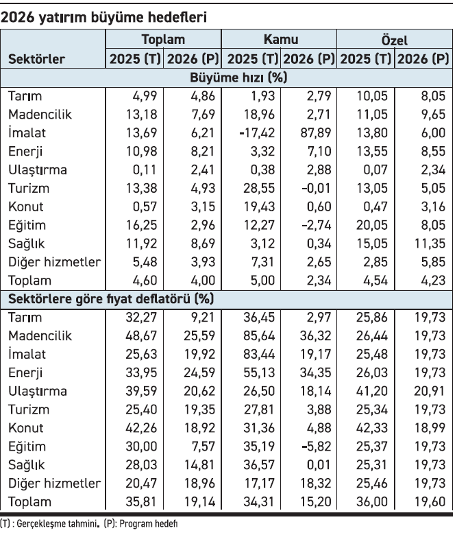 Ekonomi yönetiminin hesaplarına göre 2025’te 10 ana sektörün 6’sında çift haneli büyüme gerçekleşecek. Buna karşın 2026’da hiçbir sektörde çift haneli büyüme olmayacak. Yatırım büyümesi hızında en büyük kayıplar eğitim, turizm, imalat sanayii ve madencilikte yaşanacak. Eğitim yatırımlarında büyüme hızı yüzde 16,25’ten yüzde 2,96’ya düşecek. Yatırım büyüme hızları turizmde yüzde 13,38’den yüzde 4,93’e, imalat sanayiinde yüzde 13,69’dan yüzde 6,21’e, madencilikte yüzde 13,18’den yüzde 7,69’a inecek.