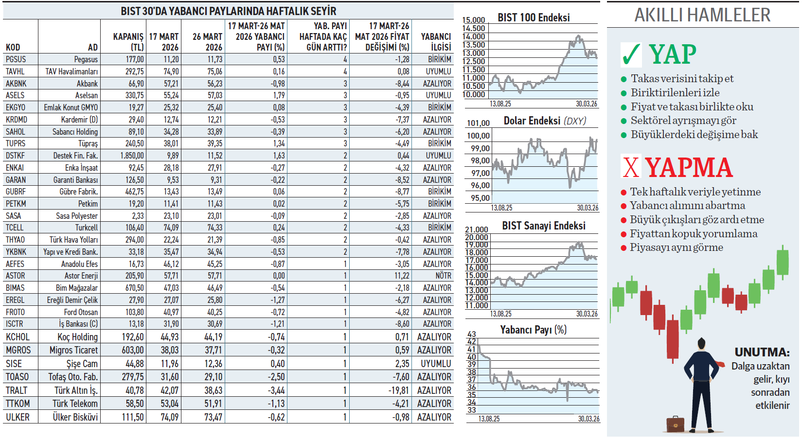 BIST 30’un 17-26 Mart takas verileri, yabancıların panik ortamı oluşturmadan sakin ve kararlı bir satış planı çerçevesinde hareket ettiğini gösteriyor. Endeksteki hisselerin üçte ikisinde satış tarafında yer aldılar. Türk Altın İşletmeleri ve Tofaş Oto’da sırayla 3,4 ile 2,5 puanlık pay azaltımı satış dalgasına öncülük etti. Alımlar ise ağırlık olarak korunaklı şirketlere yönelikti. Aselsan ve Tüpraş’taki sınırlı alımlar dışında endeks adeta satıcıların kuşatması altında kaldı. Yabancı fonlar, önceki hafta ayağını hafifçe dokundurduğu frenden çekerken pozisyon küçülterek defansif ağırlığını artırdı.
