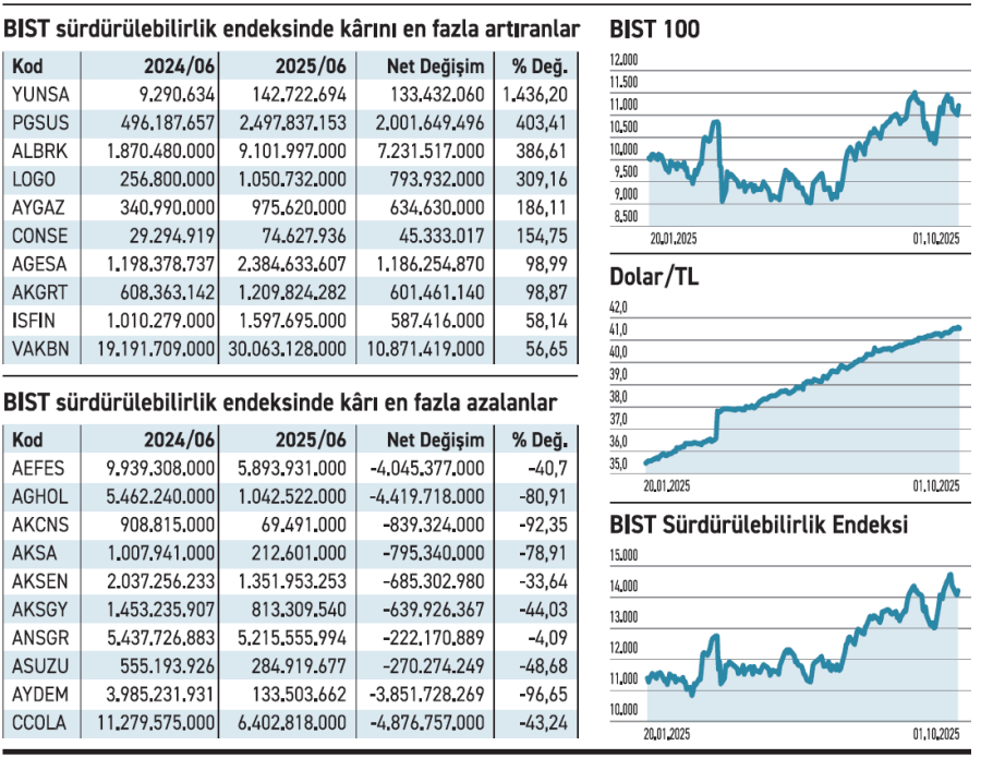 Sürdürülebilirlik, şirketlerin faaliyetlerini yürütürken çevresel, sosyal ve ekonomik dengeleri gözetmesini gerektirir. BIST Sürdürülebilirlik Endeksi’ne dahil firmalar bu hassasiyeti gösterenler olarak öne çıkar. Endeks kapsamında toplam 89 şirket yer alıyor. Bu şirketlerden 10’u kârını %50’nin üzerinde büyütmeyi başardı. En yüksek kâr artışı %1.436 ile dikkat çekti. Kârını en fazla düşüren firmanın oranı da %96 oldu.