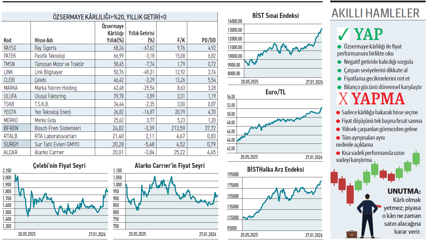 Borsada sermayesini %20’nin üzerinde verimle çalıştıran 15 şirket bulunuyor. Söz konusu firmaların, özsermaye kârlılığı %68’lere varmasına rağmen, hisseleri %70’e ulaşan kayıplar yaşadı. Peki piyasa neden bu hisselere sırtını döndü?