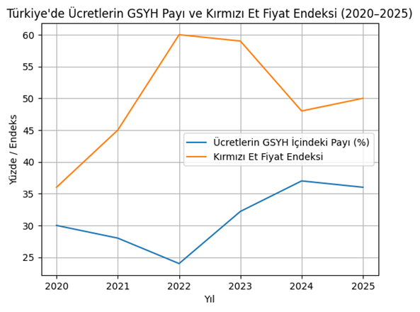 2020–2025 döneminde ücretlerin GSYH içindeki payı ile kırmızı et fiyat endeksi arasındaki ayrışma, emek gelirlerinin reel satın alma gücünün temel gıda fiyatları karşısında sistematik biçimde aşındığını göstermektedir. Diğer bir deyişle ücretlerin milli gelirden aldığı pay ile temel gıda fiyatları, kırmızı ette olduğu gibi, arasında kopukluk vardır. Bu durum, gıda piyasasının artık yalnızca tarım politikası değil, doğrudan gelir dağılımı ve sosyal politika meselesi olduğunu göstermektedir.
