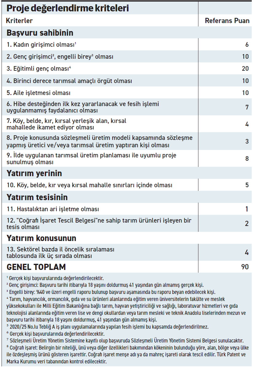 - Tarımsal üretim planlaması kapsamında yer alan illerde, tarımsal üretim planlamasında belirtilen ürünlere yönelik sunulan projeler artı puan verilerek öncelikli olarak değerlendirilir.