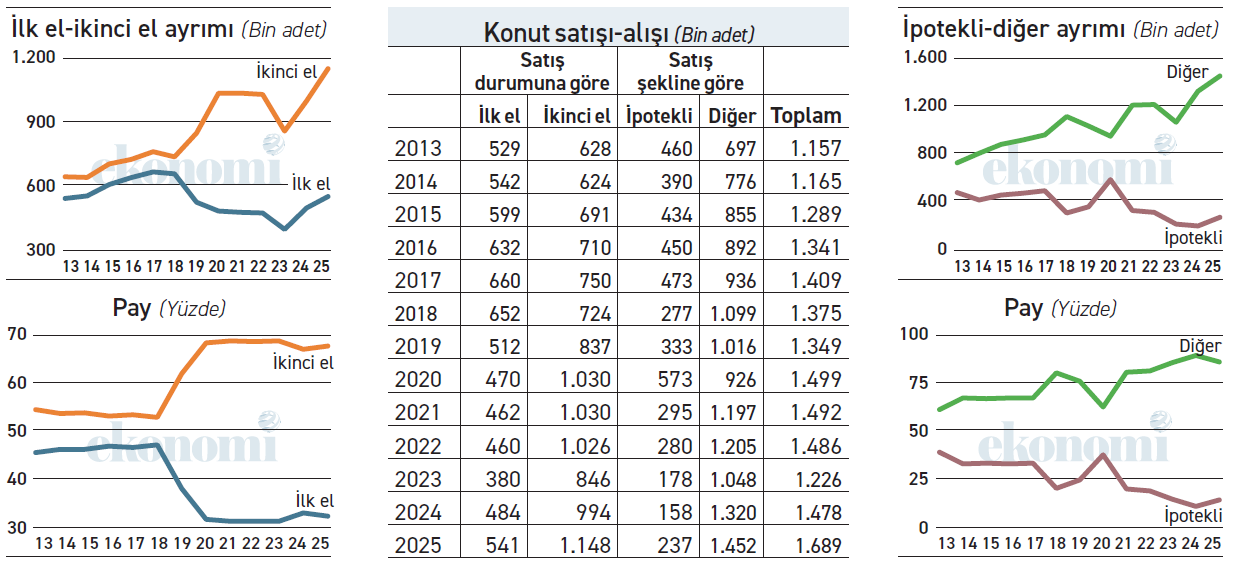 Son yıllarda faizlerin yüksek seyretmesi ipotekli satışların çok düşmesine yol açtı. Her ne kadar geçen yıl önceki yıla göre yüzde 50’ye yakın önemli bir artış varsa da ipotekli satışlar hâlâ 2022 ve öncesinin çok altında. Hele hele faizlerin düşük seyrettiği 2020 yılında 573 bin adetlik ipotekli satış, geçen yıl 2024’e göre yüzde 50 artmakla birlikte ancak 237 bine ulaşan satışın bir kattan fazla üstünde.