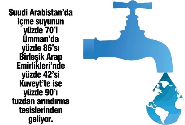 Yağışın son derece sınırlı olduğu, büyük nehirlerin bulunmadığı Körfez ülkelerinde milyonlarca insanın içme suyu ihtiyacı deniz suyunun arıtıldığı tuzdan arındırma tesislerine bağlı.