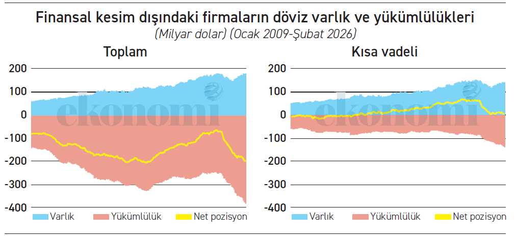 Finansal kesim dışındaki firmaların toplam net döviz pozisyonu eksi 200 milyar dolar ama kısa vadeli net pozisyonda 4,6 milyar dolar fazla var.