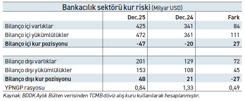 İkinci unsur ise döviz kredilerinde büyüme sınırı uyguluyor olmamız. Verilerini incelediğimiz 2025 yılı içinde döviz kredilerinde büyüme sınırı 8 haftalık dönemler için yüzde 1 düzeyindeydi. Ocak 2026’da getirilen düzenleme ile döviz kredilerinde izin verilen maksimum büyüme hızı yüzde 0,5’e düşürüldü. Yani altın ve gümüşle kredi veremeyen bankalar dövizle verdiği kredileri de azaltacak. Böylece önümüzdeki dönemde bilanço içi pozisyonun daha da büyüdüğünü ve bu riski dengelemenin maliyetinin daha da arttığını göreceğiz muhtemelen.