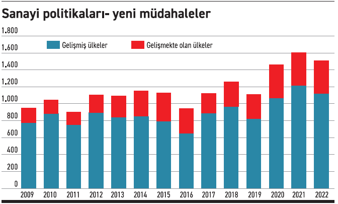 IMF’nin son Küresel Ekonomik Görünüm Raporu ‘nda bir tam ünite bu sanayi politikalarına ayrılmış durumda. Grafikte gelişmiş ve gelişmekte olan ülkelerin (GOÜ) uyguladığı sanayi politikası adedini görebilirsiniz. Örneğin 2022’de gelişmiş ülkeler 1134, GOÜ de 392 tane sanayi politikası uygulamış. GOÜ’nün tamamında asgari ücret ve kurun sanayi politikası olarak kullanıldığını varsaysak bile 392’yi dolduramıyoruz. Demek ki bakılacak başka alanlar var ve diğer ülkeler çoktan bu alanlarda sanayi politikası üretmeye başlamış.