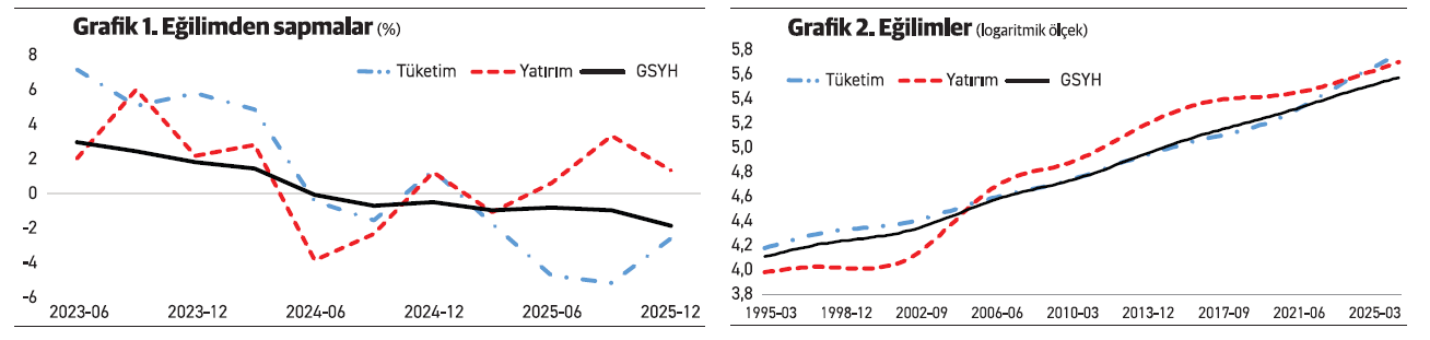 Durum şu: Özel tüketim harcamaları uzun dönemli eğilimin altında seyrediyor. Yatırım harcamaları ise bunun tersi bir gelişme gösteriyor. GSYH’de uzun dönemli eğiliminin altında ama özel tüketim harcamalarına göre bu sapma çok daha sınırlı. Eğilim grafiği için fazla yorum yapmaya gerek yok.