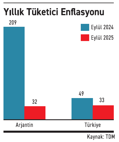 Aylık enflasyon trendinin bozulmasıyla birlikte yıllık enflasyon da yüzde 33 civarına sıkıştı. Enflasyondaki iyileşmenin durmasıyla, OECD ülkeleri arasında en yüksek enflasyona sahip ülke konumuna geldik. Hatırlanacağı üzere, bir yıl önce Arjantin’de enflasyon yüzde 200’lerin üzerindeydi. Ancak Arjantin uyguladığı makro-finansal istikrar programının katkısıyla eylül itibarıyla enflasyonu yüzde 32’ye düşürerek OECD enflasyon sıralamasında Türkiye’nin altına indi.
