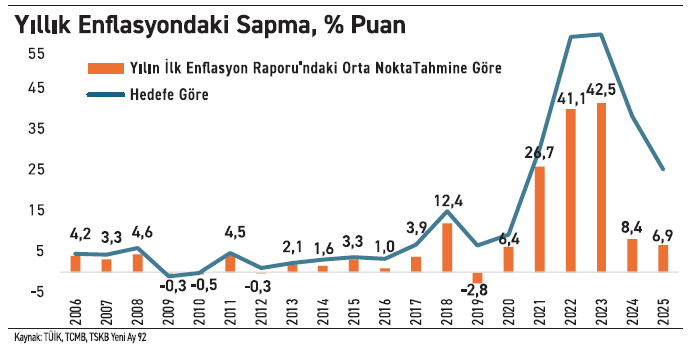 Aralık’taki diğer önerim Para Politikası Kurulu (PPK) notunun dilinde değişiklik yapılmasıydı (olmadı). Faiz indirimine dayalı yatırım hikayesinin devam etmesini isteyen piyasa, faiz patikasıyla enflasyon görünümü arasındaki bağı kopardı. %16’lık ara hedefi geçtim, üst bant olan %19’da bile ısrar eden yok. Bu nedenle, TCMB’nin 2026’da her toplantıda faiz indirimi yapmayabileceğinin sinyalini vermesini, yani “Faize göre enflasyon değil, enflasyona göre faiz!” demesini gerekli görüyorum.