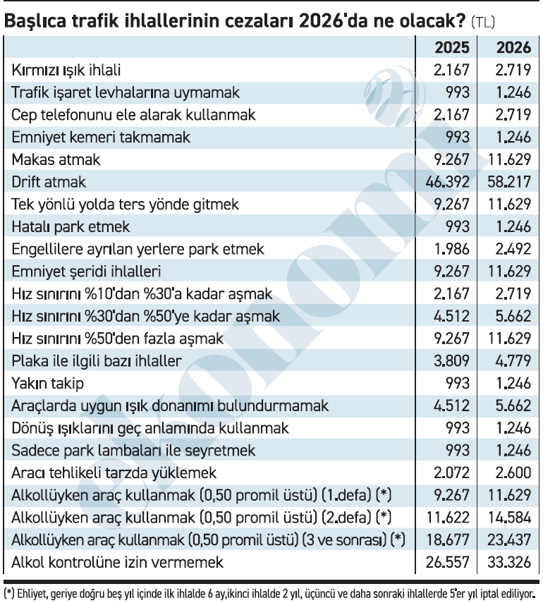 Trafikte cezaları artırmayı öngören düzenleme yasalaşırsa durum tabii ki değişebilir ama mevcut durumda bu yılın cezaları 2026 için yüzde 25,49 oranında artırılacak.