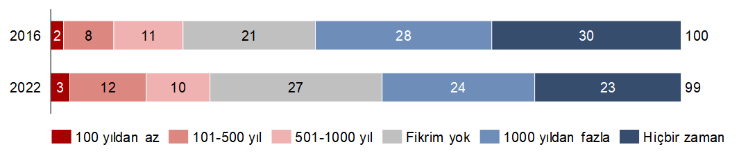 YouGov anketine göre, 2016 yılında İngilizlerin yüzde 30’u insanoğlunun neslinin hiçbir zaman tükenmeyeceği kanaatindeymiş. 2022 yılında bu oran yüzde 23’e düşmüş. Hiçbir zaman neslimiz tükenmez diyenlerle 1000 yıl daha tükenmez diyenleri toplayıp baksanız yine aynı sonuç. 2016 yılında yüzde 58’den yüzde 47’ye düşüyor insanoğlunun geleceğinden umutlu olanlar.