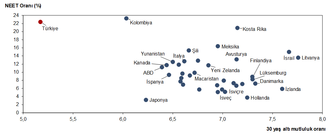 Dikey eksen ise ne istihdamda ne de eğitimde olan gençlerin oranını gösteriyor. Bir nevi iş arayıp bulamayanlar işte. Bu oran Türkiye’de, Kolombiya’da, Kosta Rika’da yüksek.