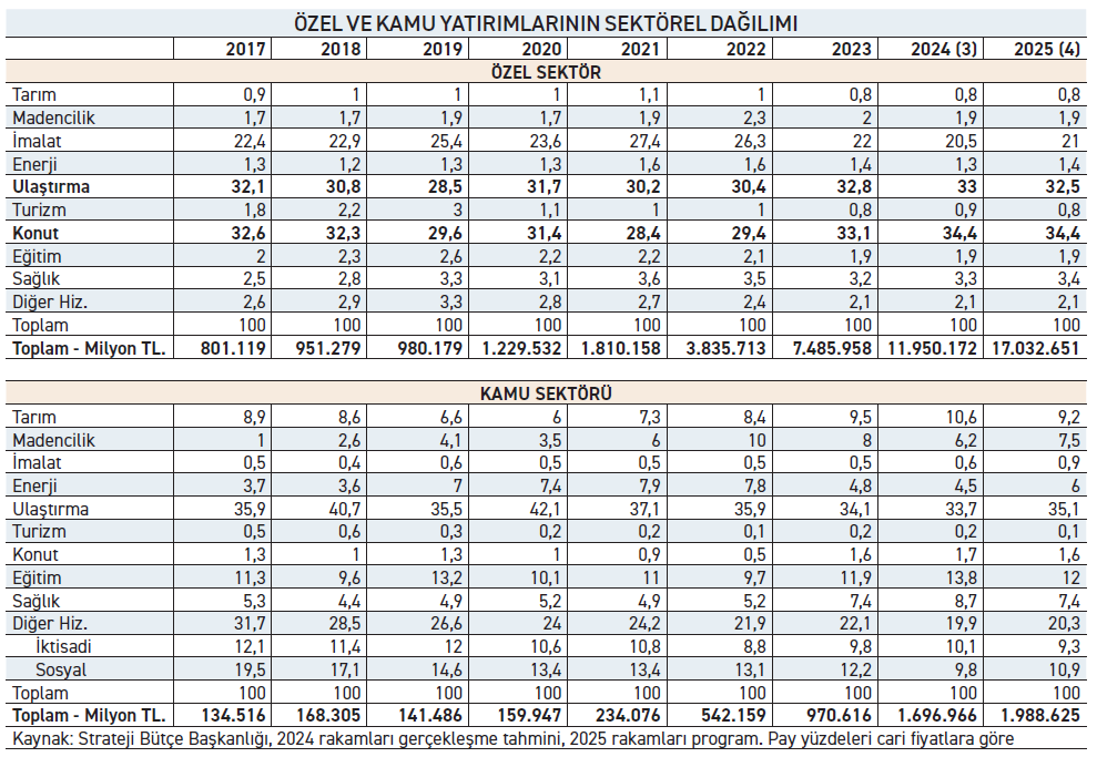 Özel sektör yatırımlarında konutun payı 2017’de yüzde 32,6, birkaç yıl yüzde 29 –28 gibi rakamlar var. Çok sayıda yılda payı yüzde 30’un üstünde. 2024’te yüzde 34,4’e çıkmış. 2025 yılı rakamı da aynı düzeyde. Ulaştırma yatırımlarının toplam özel sektör yatırımları içindeki payı 2017’de yüzde 32,1 düzeyinde. İzleyen yıllarda da bir yıl hariç sürekli yüzde 30’un üzerinde gerçekleşmiş. 2024’ü yüzde 33 payla bitirmiş. 2025 yılı programında yüzde 32,5 düzeyinde pay öngörülmüş.
