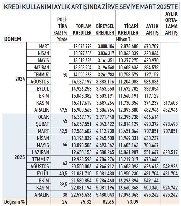Politika faizinin yüzde 50’ye yükseltildiği Mart 2024’ten, son faiz indiriminin yapıldığı Aralık 2025’e faiz oranında yüzde 24 düşüş gerçekleşmiş oldu. Aynı dönemde toplam, bireysel ve ticari kredilerdeki artış sırasıyla yüzde 75,3 – 82,7 – 73 oldu. Kredi kullanımında aylık artışın 707 milyarı bulduğu Mart 2025 seviyesi, faiz oranı 4,5 puan altına geldiği koşullarda bile bir daha yakalanamadı.