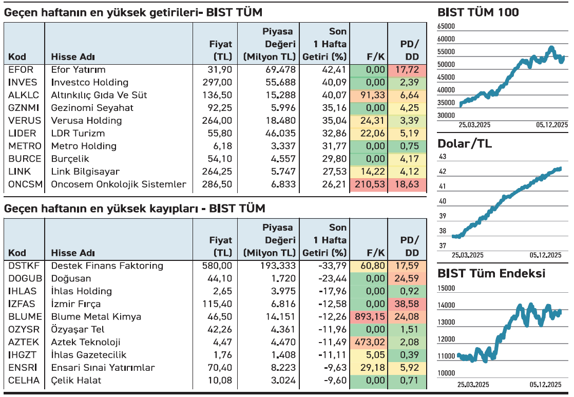 Borsada geçen hafta 324 hisse yükseldi. İlk 10 hissede getiriler yüzde 26’nın üzerinde gerçekleşirken, üç hisse yüzde 40’ı aşarak haftanın en güçlü performansını sergiledi. Aynı sürede 207 hisse geriledi. En sert düşüş yüzde 34’ü buldu.