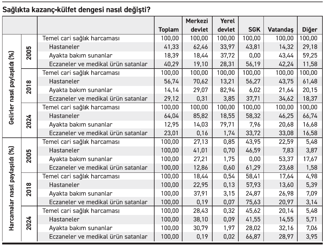 Türkiye İstatistik Kurumu’nun (TÜİK) yayınladığı sağlık harcamaları istatistikleri bu durumu bütün çıplaklığıyla gözler önüne seriyor. Sağlıkta birinci reformun pilot olarak başladığı yıl olan 2005 yılı ile şehir hastanelerinin hemen öncesi 2018 yılı ve 2024 yılında sağlık harcamalarının ve gelirlerinin nasıl paylaşıldığını karşılaştırınca bu resim net olarak ortaya çıkıyor: