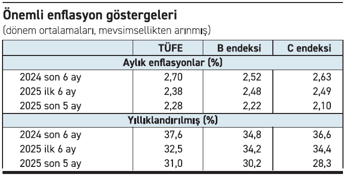 Son beş ayın mevsim etkisinden arındırılmış aylık enflasyon ortalamaları 2026 sonu yüzde 16 enflasyon hedefi ile uyumlu değil. Bu aylık değerlerin ima ettiği yıllık enflasyon yüzde 28 ile yüzde 31 arasında. Ancak bu değerler son beş aylık ortalamalardan elde edildikleri için yüksek kalabilir; çünkü beş aylık dönemdeki eğilim aşağıya doğru olabilir. Öyleyse, bu eğilimi de dikkate almak gerekir. Peki, öyle mi?