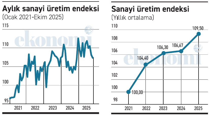 Bakılması gereken üçüncü ve belki de en önemli gösterge ise üretimin geldiği, gelebildiği düzey. TÜİK sanayi üretiminde baz yılını 2021 olarak alıyor. Yani 2021 yılının ortalamasındaki üretim 100 birim kabul ediliyor. 2021 yılı ortalamasında 100 birim üretim yapan Türkiye takvim etkisinden arındırılmış veriye göre aradan geçen dört buçuk yılı aşkın sürede, bu yılın ekiminde ne kadar üretim yapmış; yalnızca 110,4 birim. Bu yılın ilk on ayındaki ortalama üretim ise daha da düşük; 109,5 birim. 2025 tamamlandığında yıllık ortalama üretimin 110’a çıkacağını varsayabiliriz, çünkü üretim yılın son aylarında yüksek olur, şu durumda 2021’den 2025’e dört yıldaki üretim artışı yalnızca yüzde 10! Dört yılda yüzde 10 demek, yıllık ortalama yüzde 2,4 artış demek.