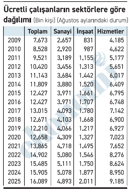 TÜİK’in dün açıkladığı ağustos ayına ilişkin veriler ücretli çalışan 16,1 milyon kişinin 4,9 milyonunun sanayide istihdam edildiğini gösteriyor. İnşaat sektöründe çalışanların sayısı 2 milyon, hizmetler ve ticaret sektörlerinde çalışanların sayısı ise 9,2 milyon.