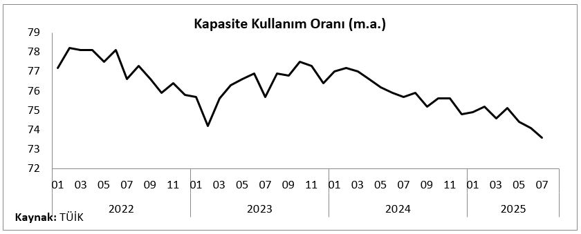 Sanayiye kapasite kullanım oranı açısından baktığımızda tablo çok daha vahim. Kapasite kullanım oranı bir buçuk yılı aşkın süredir düşmeye devam ediyor. Eylül ayı itibarıyla gelinen oran, Covid sonrası dönemin en düşük değerine işaret ediyor.